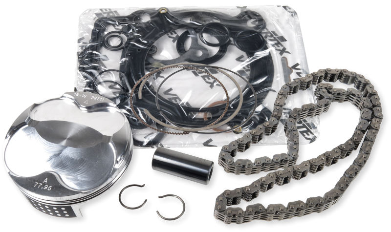 The Top End Kit contains: Top end gasket kit, Pro Replica pisto and chain